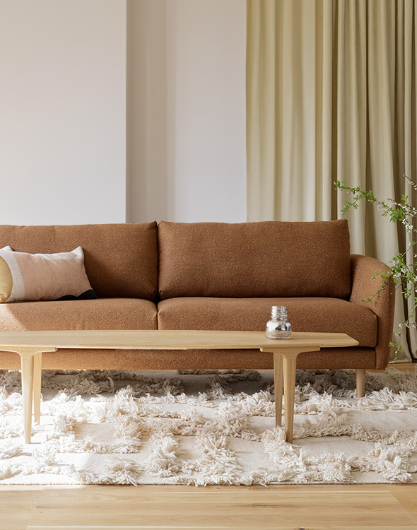 Das Gestell des Sofas BJERT besteht aus nachhaltigem FSC®-zertifiziertem Holz und weiteren hochwertigen Materialien auf Holzbasis.