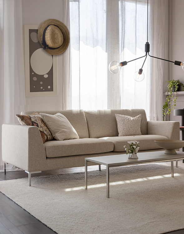 Das Sofa OLVE ist in hochwertigen Stoff- und Lederbezügen erhältlich. Die Bezüge sind fest verarbeitet und nicht abziehbar.